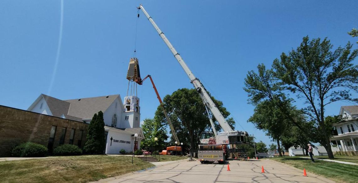 He brought the church’s bell back to the building on July 10 with a skid loader and set it down. It was hoisted up to the bell tower and installed early in the morning on July 11, just over a year after it was blown down with the steeple and found on the ground to the west of the church.