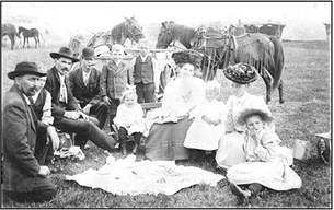 "The train of 14 well-filled coaches left the Union Pacific depot [in Omaha] at 8:30 a. m. . . . The members of the band had considerable trouble when the train started, as it was discovered that suspicious persons were on board and that between 30 and 40 boys were trying to beat their way and were concealed John Nelson's photograph of picnickers, dating to 1907-1917, included several horses and two buggies in the background.
