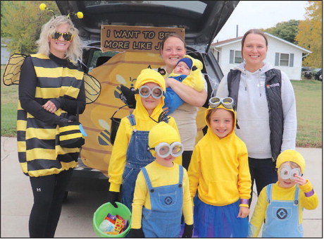 Sporting a whole lot of yellow are bumble bee Julie Slagle, Emily Eckstrom holding baby Minion Dawson, Brianna Schmit; front: Minions Will Eckstrom, Clay Eckstrom, Anna Eckstrom and Cade Schmit
