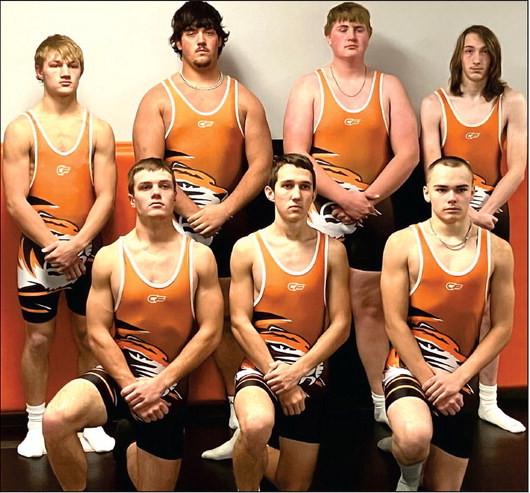 Members of the 2025-26 Osmond-Wausa wrestling team are, back row: Kaleb Gardner (left), Tate Stolpe, Aiden Stech, Hayden Schreiber; front row: Caleb Vinson, Mason True, Lane Murray