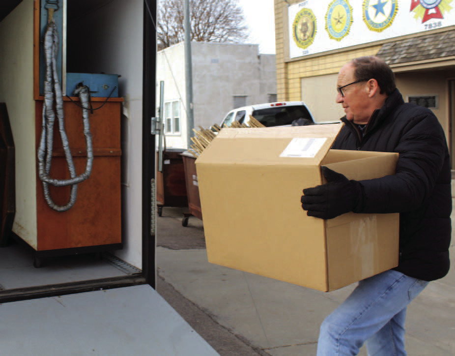 MAKING THE MOVE — American Legion Post 326 members recently began the task of moving items out of the old Legion post and into storage in the first stage of the move to a new building on State Street. Legion members plan some remodeling in the former Ashburn Funeral Home before the final move.