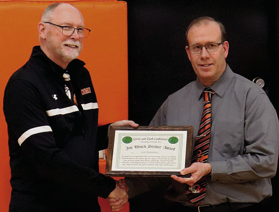 Joe Ortmeier received the 2025 Jim Winch award at the Lewis and Clark Conference Basketball Championship Games finals at Wayne State College on Monday night, Feb. 10. He was then recognized on Thursday night, Feb. 13, at halftime of the girls' basketball game against Wausa in Osmond.