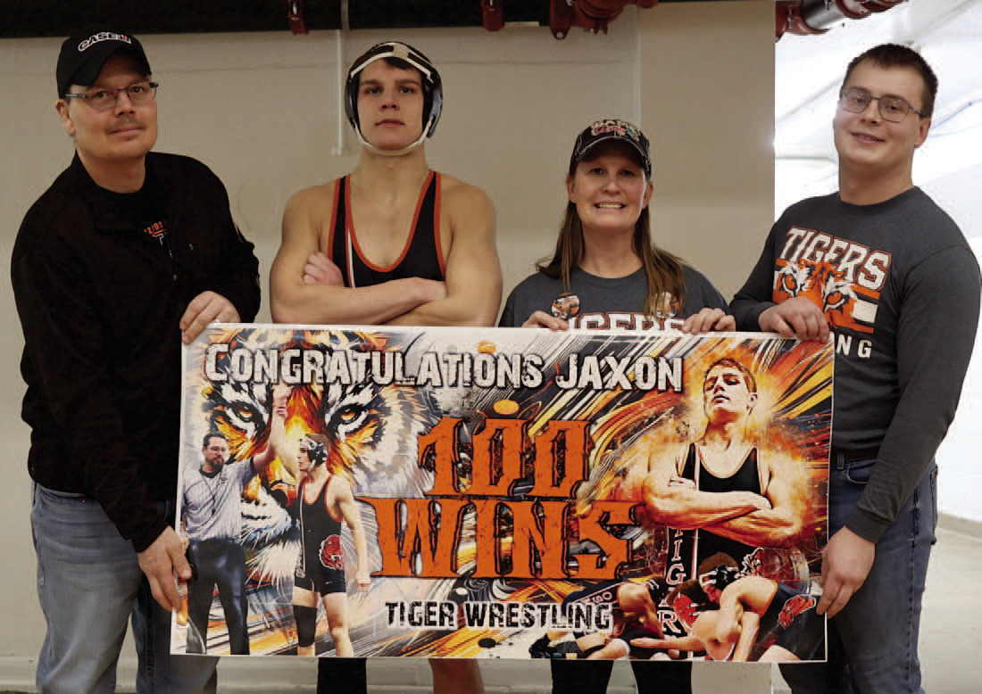 Jaxon Vinson grabbed his 100th career win in wrestling, pinning Rigen Riessland of Pleasanton in a mere 38 seconds for the milestone victory.