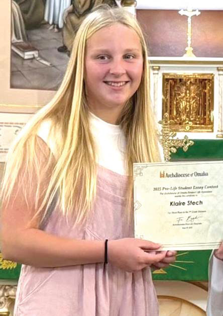 Klaire Stech, a student at St. Mary’s Catholic School, completed in a Pro-Life Student Essay Contest and placed third in the seventh grade category.