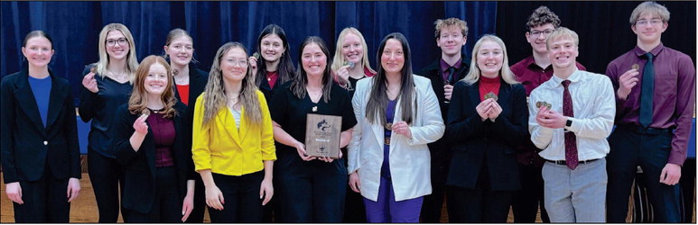 The OHS speech team proudly displays its runner-up plaque at the West Holt meet, back row: Ava Kumm (left), Adalyn Koehler, Katarina Miller, Kaleigh Miller, Erin Aschoff, Jack Berg, Justin Rohloff, Easton Steinkraus; front row: Piper Hoffman, Addison Miller, Jade Halsey, Ava Reikofski, Meagan Wagner, Donovan Heiman