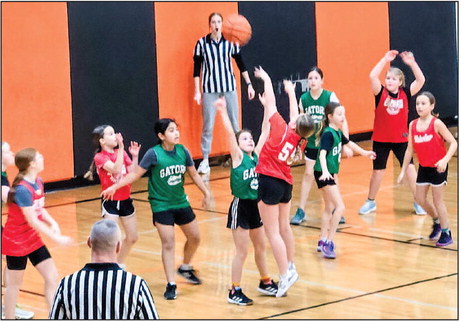 Merrit Tarr shoots at the league tournament as Aven Torre, Raelynn Schieffer, Clara Steffen, and Shailey Orr rebound.