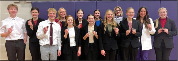 Speech team members with their medals include, back row: Jack Berg (left), Kaleigh Miller, Erin Aschoff, Katarina Miller, Ava Kumm, Adalyn Koehler, Ava Reikofski, Meagan Wagner; front row: Donovan Heiman, Piper Hoffman, Evynn Kumm, Kenley Friedrich, Clara Steinkraus