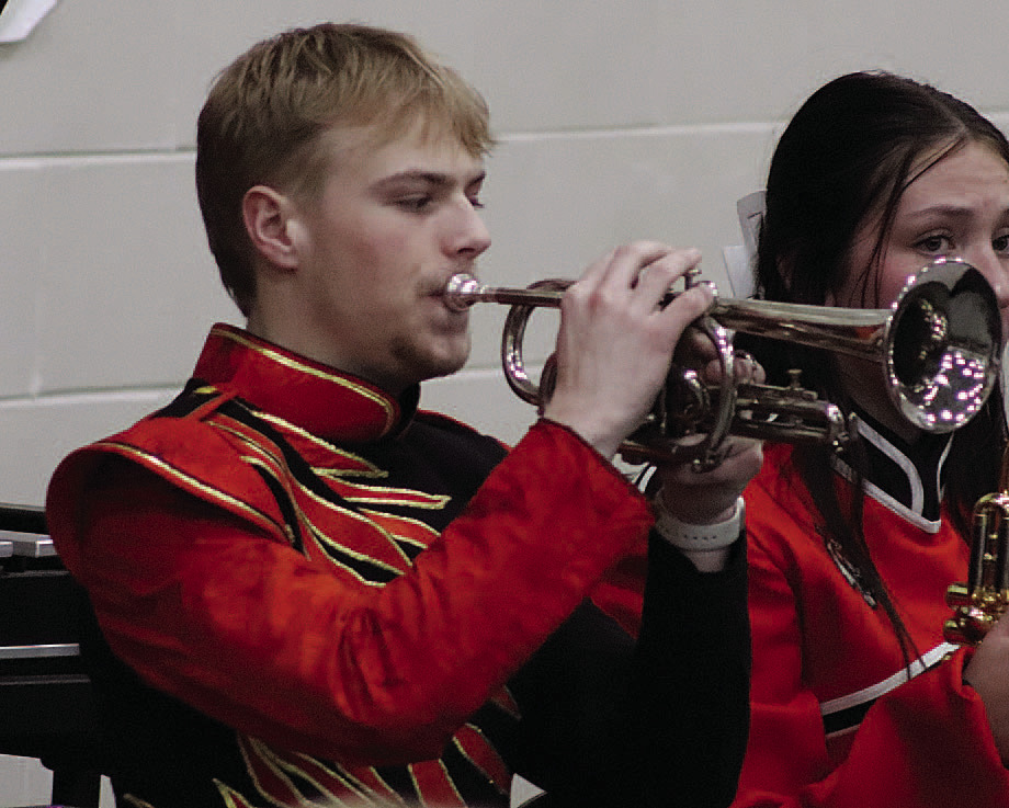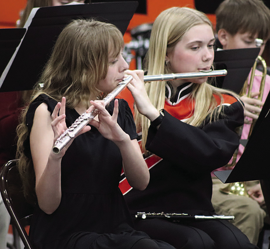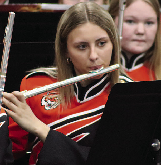 The junior high mixed chorus was first up with "Cross The Wide Missouri," followed by "Aurora Borealis." The senior high mixed chorus then sang "The River," featuring soloists Ashlyn Spangler and Piper Hoffman. They followed that with "Agnus Dei" and "A New Way." Next it was the junior high band's turn. Their first song was "Brandon Bay." The next was "Peer Gynt Suite #1," which included three movements: "Morn - ing Mood," "The Death Of Ase" and "In The Hall Of The Mountain King." The senior high concert band began with "A Mother's Hymn," which is reminiscent of the tune of "How Great Thou Art." This song featured soloist Donovan Heiman on the trumpet. "Prelude & Primal Danse" was performed next, with a solo by Carriana Kumm on the flute.