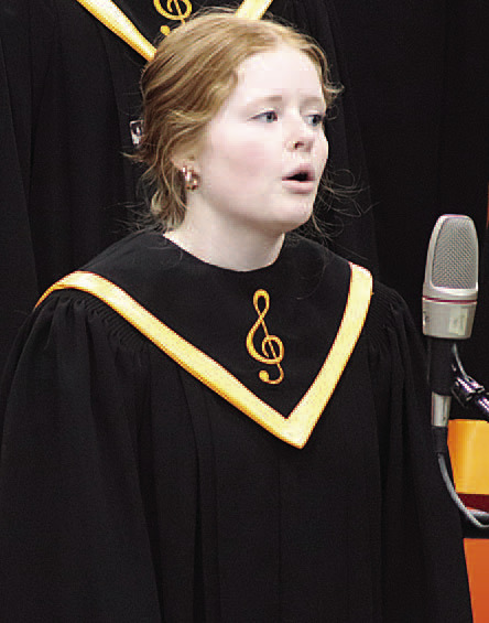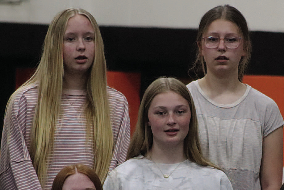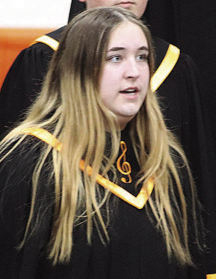 Top photo: Members of the junior high chorus; bottom photos: Ashlyn Spangler (left) and Piper Hoffman were soloists of the senior high mixed chorus.